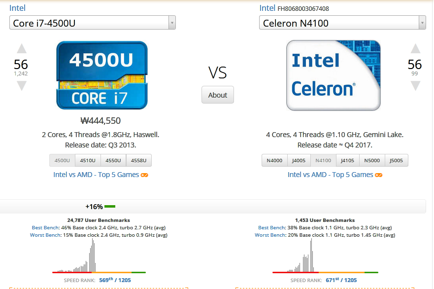 내가 자주 기준으로 삼는 셀러런 N4100 을 기준으로 하면 이보다 빠르긴 한데, 겨우 16% 차이이다.