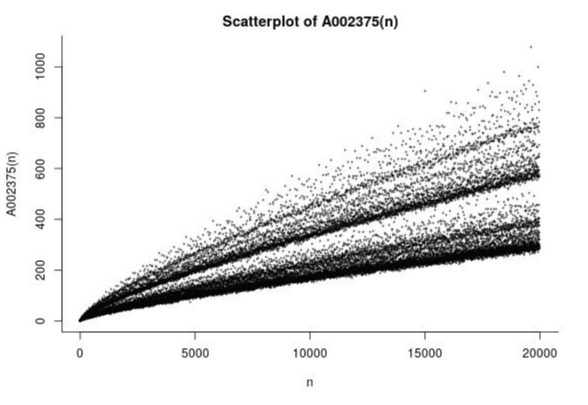 관련 문제를 조금 변형해서 주어진 n 에 대해서 이를 골드바흐의 수로 가지는 최소의 자연수라는 수열도 생각할 수 있다.  2, 4, 10, 22, 34, 48, 60, 78, 84, 90, 114 로 진행되는 수열인데, 이 역시 그래프로 그리면 다른 형태의 혜성과 같은 그림이 나온다.