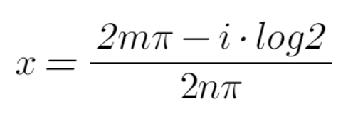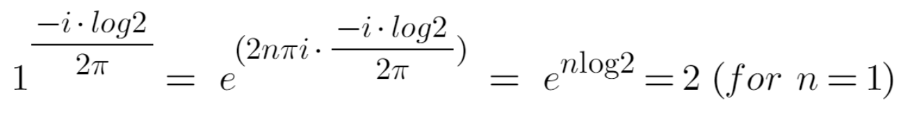 여튼 이 식의 답을 얻기 위해서는 '오일러의 공식'에서 유래되는 e^(2n pi i) = 1 이 필요하다. 그냥 냅다 이 식을 집어 넣고 양변에 log 를 취해서 답을 구하면, 아래와 같은 해를 구할 수 있다.