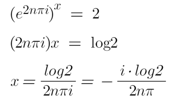 여튼 이 식의 답을 얻기 위해서는 '오일러의 공식'에서 유래되는 e^(2n pi i) = 1 이 필요하다. 그냥 냅다 이 식을 집어 넣고 양변에 log 를 취해서 답을 구하면, 아래와 같은 해를 구할 수 있다.