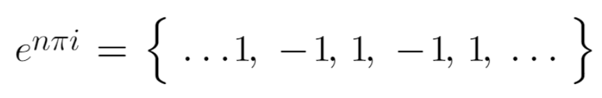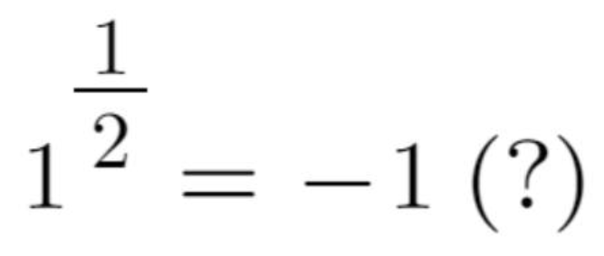 e^(n pi i) 에 정수 n { ... , -2, -1, 0, 1, 2, ... } 을 차례로 넣으면 { ... , 1, -1, 1, -1, 1, ... } 이 되어, 1 과 -1 이 반복해서 나온다. 다시 말해 1^(1/2) 은 다가함수이고, 그래서 이런 식을 성립하게 만드는 이유가 된다.