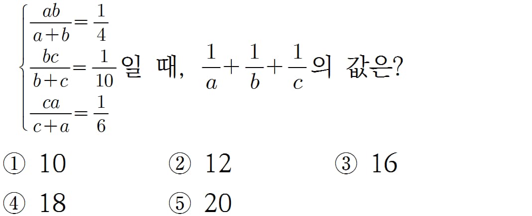 세개의 식에 대해서 역수를 취해서 정리하면 이렇게 되고, 이를 다 더한 뒤 2로 나누면, 간단히 답이 나온다.