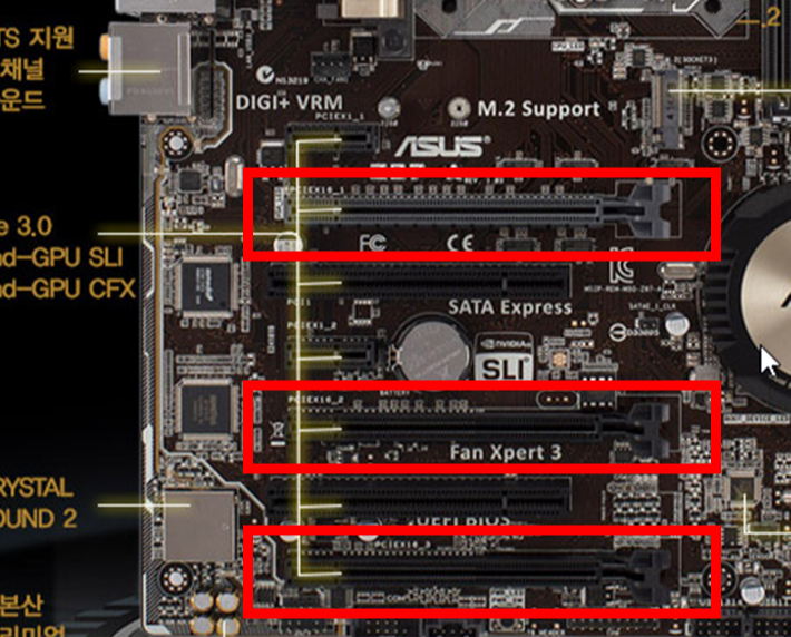 예를 들어 Z97 칩셉을 쓰는 마더 보드의 경우 PCIe 16 슬롯이 3개 달린 보드들이 있습니다.
