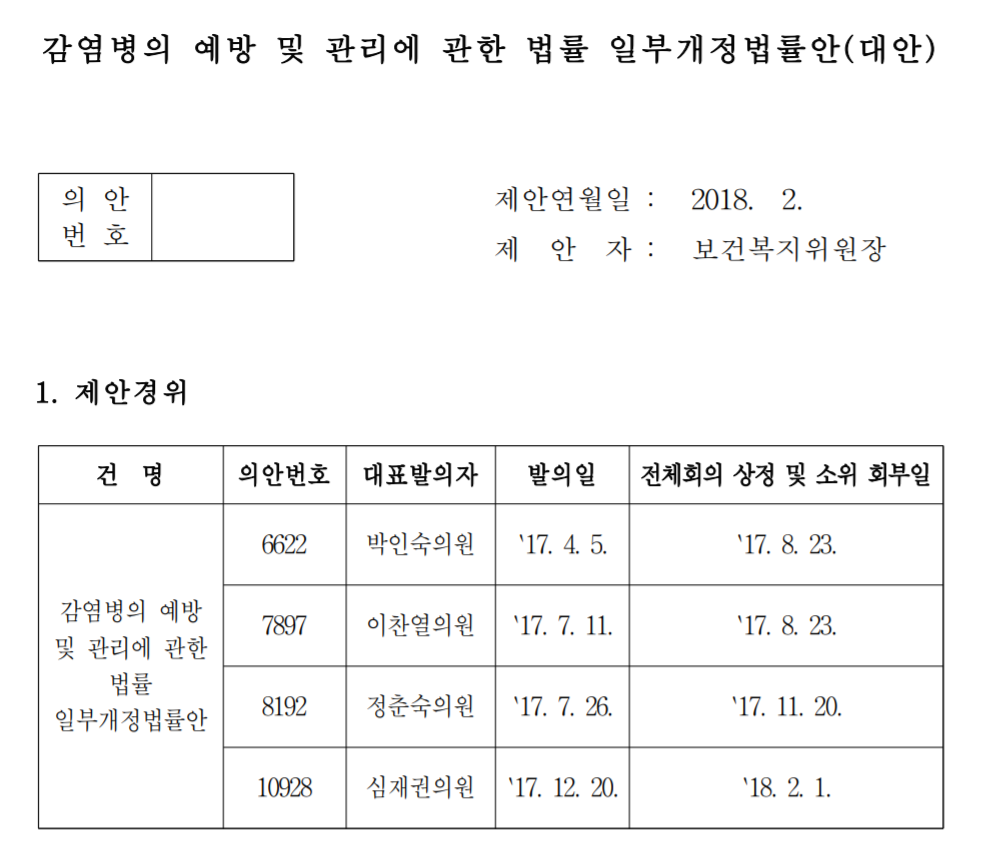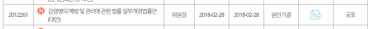 여기에서 '의안명'에 '감염병'을 넣고 검색하면 해당 법안에 대해서 개정안을 낸 안건들이 모두 검색된다. 그중에서 법안이 가결되고 공포된 안건은 바로 이것이다.