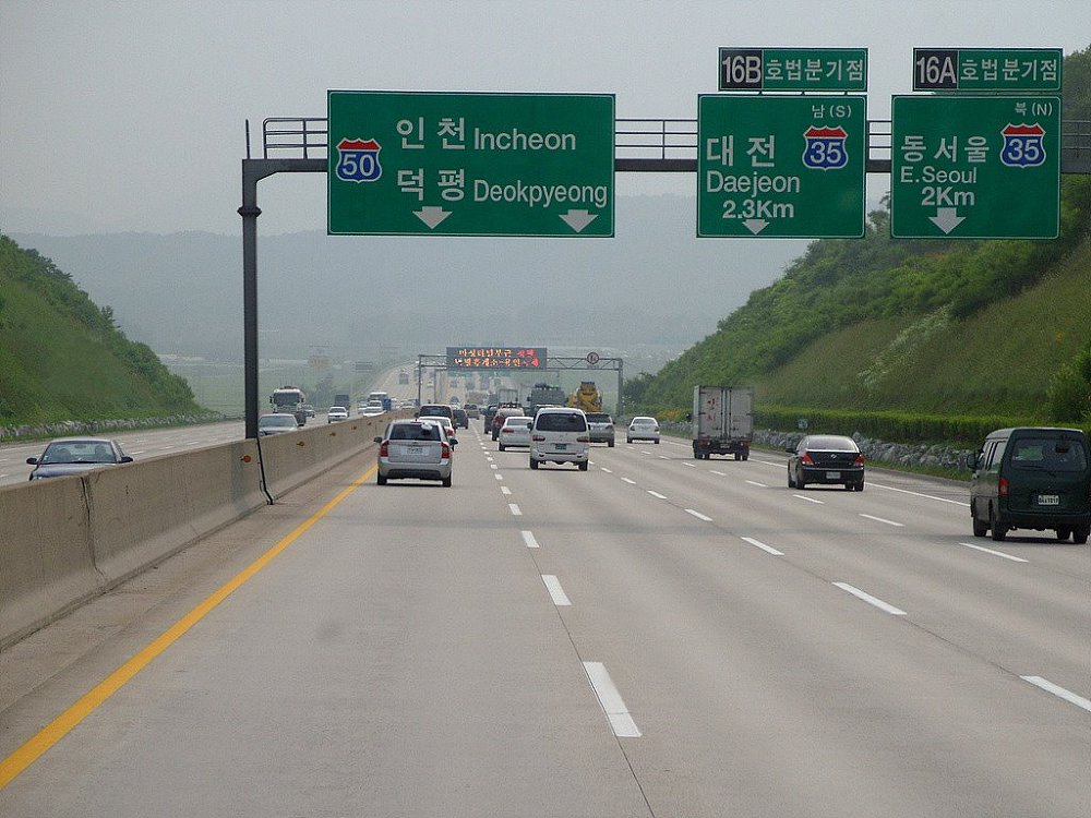 고속도로 표지판이 중앙 분리대에 걸쳐 있어도 안된다.