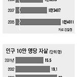 중앙일보 기사에서 발췌한 그래프 이다.. http://article.joins.com/article/article.asp?total_id=3291373 그래프만 언듯 보면,, 매년 자살자수가 계속 증가해서,, 거의 2배이상 증가한것 같은 느낌이 나는 그래프이다.. 하지만, 년도가 섞여 있다.. 장난 하냐??? 그 아래, 인구 10만명당 자살자 그래프 역시 연도가 섞여 있다.. 2006년에 10만명당 23명으로 나와 있는데,, 그 아래 그래프에서는 21.5 명으로 나온다.. 둘중 하나는 틀린거 같다.. 첫번째 그래프를 연도별 정렬을 하고,, 그래프 잘림으로 인한 왜곡을 없애면 다음과 같은 그래프가 나온다.. 년도별로 오르내림이 조금 있지만,, 13000 ~ 14000 명 근방에서 유지되고 있는 수준이다....